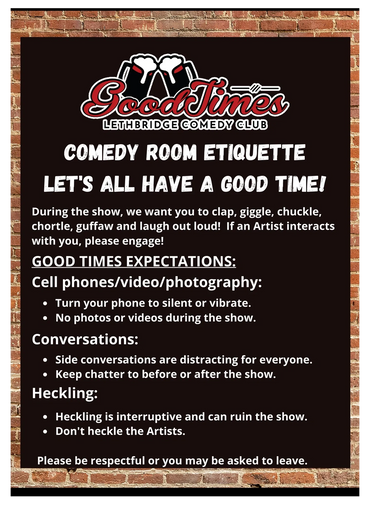 Live comedy is an amazing experience, but in general it's not very "clean". Many of our comics will have material on politics, sex, religion, and other controversial topics. So, we ask you, our wonderful customer, that we have an open mind, laugh, have fun, and please remember that these are jokes intended to be funny and no harm is ever the intention.